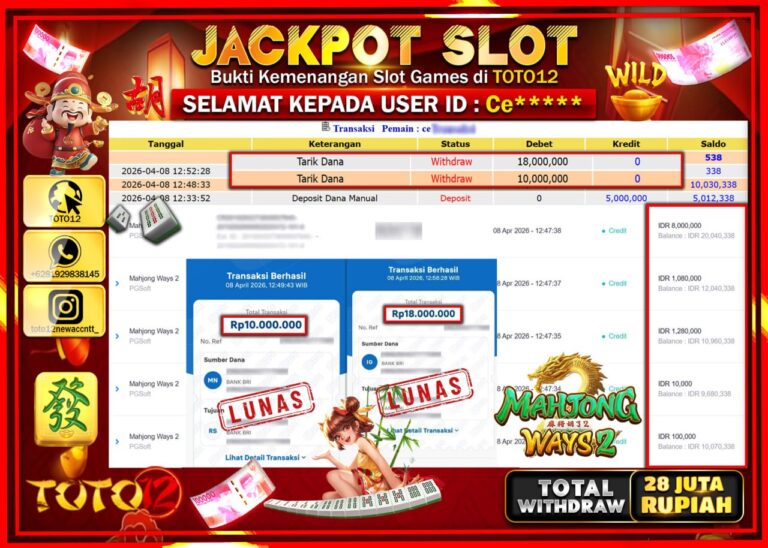 Selamat kepada Member Kami Ce***** Telah Jackpot dan berhasil mendapatkan kemenangan besar pada permainan JACKPOT SLOT GAME (WILD BANDITO) Dengan Kemenangan Sebesar Rp.28.000.000–. Setelah mengisi Fomulir Withdraw dengan Kurang waktu 1-2 Menit Dana sudah kami Trasnfer kepada Pemilik Userid dan dana sudah dapat di cairkan oleh pemenang. Bukti Pembayaran yang TOTO12 berikan merupakan Bukti Pembayaran yang SAH…