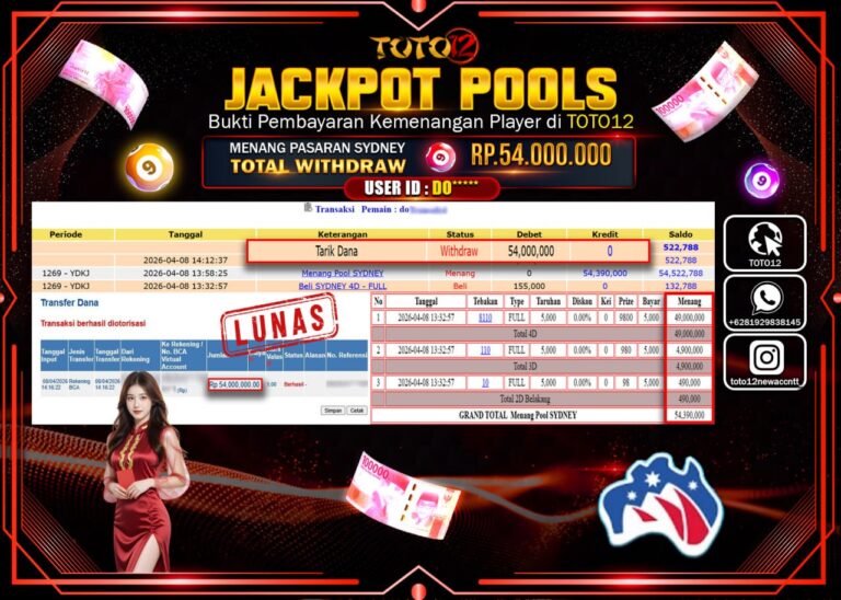 Selamat kepada Member Kami Do****** Telah Jackpot dan berhasil mendapatkan kemenangan besar pada permainan JACKPOT POOLS PASARAN ( SYDNEY ) Dengan Kemenangan Sebesar Rp.54.000.000–. Setelah mengisi Fomulir Withdraw dengan Kurang waktu 1-2 Menit Dana sudah kami Trasnfer kepada Pemilik Userid dan dana sudah dapat di cairkan oleh pemenang. Bukti Pembayaran yang TOTO12 berikan merupakan Bukti Pembayaran…