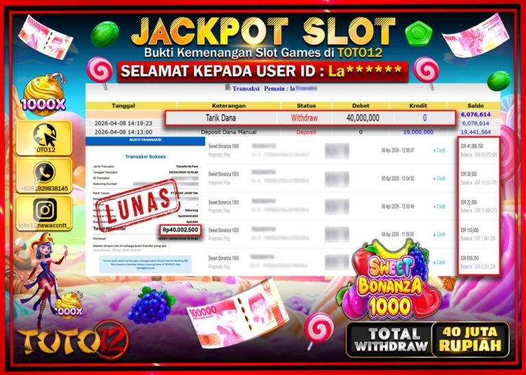 Selamat kepada Member Kami La***** Telah Jackpot dan berhasil mendapatkan kemenangan besar pada permainan JACKPOT SLOT GAME (SWEET BONANZA 1000) Dengan Kemenangan Sebesar Rp.40.000.000–. Setelah mengisi Fomulir Withdraw dengan Kurang waktu 1-2 Menit Dana sudah kami Trasnfer kepada Pemilik Userid dan dana sudah dapat di cairkan oleh pemenang. Bukti Pembayaran yang TOTO12 berikan merupakan Bukti Pembayaran…