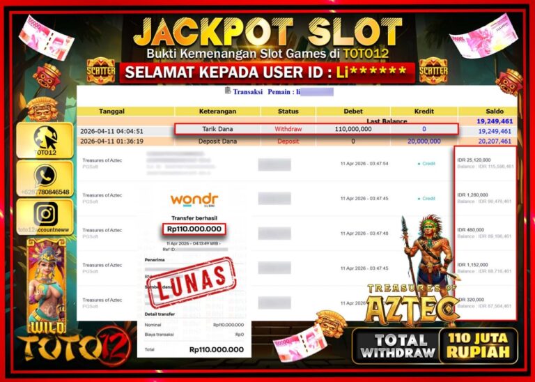 Selamat kepada Member Kami Li***** Telah Jackpot dan berhasil mendapatkan kemenangan besar pada permainan JACKPOT SLOT GAME (TREASURES OF AZTEC) Dengan Kemenangan Sebesar Rp.110.000.000–. Setelah mengisi Fomulir Withdraw dengan Kurang waktu 1-2 Menit Dana sudah kami Trasnfer kepada Pemilik Userid dan dana sudah dapat di cairkan oleh pemenang. Bukti Pembayaran yang TOTO12 berikan merupakan Bukti Pembayaran…