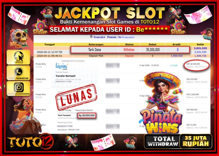 Selamat kepada Member Kami Be***** Telah Jackpot dan berhasil mendapatkan kemenangan besar pada permainan JACKPOT SLOT GAME (PINATA WINS) Dengan Kemenangan Sebesar Rp.35.000.000–. Setelah mengisi Fomulir Withdraw dengan Kurang waktu 1-2 Menit Dana sudah kami Trasnfer kepada Pemilik Userid dan dana sudah dapat di cairkan oleh pemenang. Bukti Pembayaran yang TOTO12 berikan merupakan Bukti Pembayaran yang SAH…