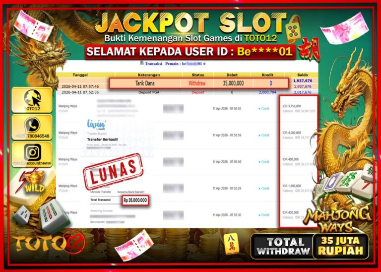 Selamat kepada Member Kami Be*****01 Telah Jackpot dan berhasil mendapatkan kemenangan besar pada permainan JACKPOT SLOT GAME (MAHJONG WAYS) Dengan Kemenangan Sebesar Rp.35.000.000–. Setelah mengisi Fomulir Withdraw dengan Kurang waktu 1-2 Menit Dana sudah kami Trasnfer kepada Pemilik Userid dan dana sudah dapat di cairkan oleh pemenang. Bukti Pembayaran yang TOTO12 berikan merupakan Bukti Pembayaran yang SAH…