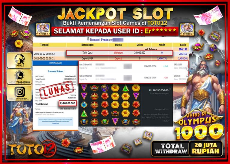 Selamat kepada Member Kami Er**** Telah Jackpot dan berhasil mendapatkan kemenangan besar pada permainan JACKPOT SLOT GAME (GATES OF OLYMPUS 1000) Dengan Kemenangan Sebesar Rp.20.000.000–. Setelah mengisi Fomulir Withdraw dengan Kurang waktu 1-2 Menit Dana sudah kami Trasnfer kepada Pemilik Userid dan dana sudah dapat di cairkan oleh pemenang. Bukti Pembayaran yang TOTO12 berikan merupakan Bukti…