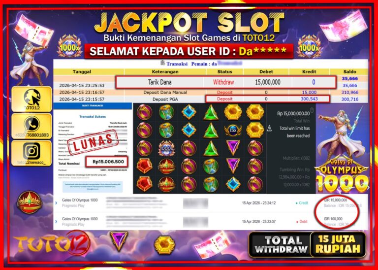 Selamat kepada Member Kami Da***** Telah Jackpot dan berhasil mendapatkan kemenangan besar pada permainan JACKPOT SLOT GAME (GATES OF OLYMPUS 1000) Dengan Kemenangan Sebesar Rp.15.000.000–. Setelah mengisi Fomulir Withdraw dengan Kurang waktu 1-2 Menit Dana sudah kami Trasnfer kepada Pemilik Userid dan dana sudah dapat di cairkan oleh pemenang. Bukti Pembayaran yang TOTO12 berikan merupakan Bukti…