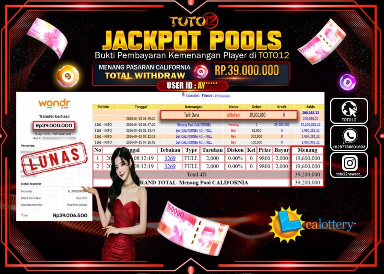 Selamat kepada Member Kami Ay****** Telah Jackpot dan berhasil mendapatkan kemenangan besar pada permainan JACKPOT POOLS PASARAN ( CALIFORNIA ) Dengan Kemenangan Sebesar Rp.39.000.000–. Setelah mengisi Fomulir Withdraw dengan Kurang waktu 1-2 Menit Dana sudah kami Trasnfer kepada Pemilik Userid dan dana sudah dapat di cairkan oleh pemenang. Bukti Pembayaran yang TOTO12 berikan merupakan Bukti Pembayaran…