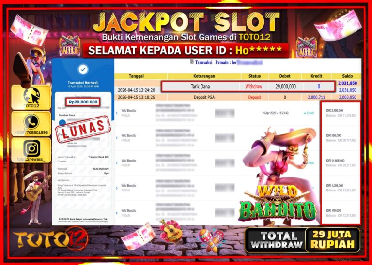Selamat kepada Member Kami Ho***** Telah Jackpot dan berhasil mendapatkan kemenangan besar pada permainan JACKPOT SLOT GAME (WILD BANDITO) Dengan Kemenangan Sebesar Rp.29.000.000–. Setelah mengisi Fomulir Withdraw dengan Kurang waktu 1-2 Menit Dana sudah kami Trasnfer kepada Pemilik Userid dan dana sudah dapat di cairkan oleh pemenang. Bukti Pembayaran yang TOTO12 berikan merupakan Bukti Pembayaran yang SAH…