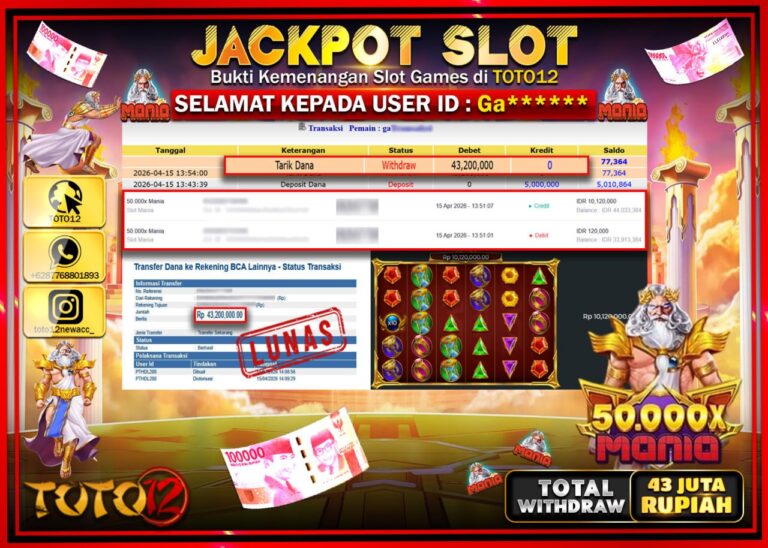 Selamat kepada Member Kami Ga***** Telah Jackpot dan berhasil mendapatkan kemenangan besar pada permainan JACKPOT SLOT GAME (50.000X MANIA) Dengan Kemenangan Sebesar Rp.43.200.000–. Setelah mengisi Fomulir Withdraw dengan Kurang waktu 1-2 Menit Dana sudah kami Trasnfer kepada Pemilik Userid dan dana sudah dapat di cairkan oleh pemenang. Bukti Pembayaran yang TOTO12 berikan merupakan Bukti Pembayaran yang SAH…