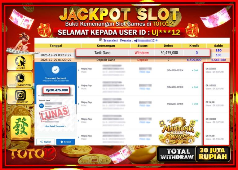 Selamat kepada Member Kami Uj****** Telah Jackpot dan berhasil mendapatkan kemenangan besar pada permainan JACKPOT SLOT GAME (MAHJONG WAYS) Dengan Kemenangan Sebesar Rp.30.475.000 –. Setelah mengisi Fomulir Withdraw dengan Kurang waktu 1-2 Menit Dana sudah kami Trasnfer kepada Pemilik Userid dan dana sudah dapat di cairkan oleh pemenang. Bukti Pembayaran yang TOTO12 berikan merupakan Bukti Pembayaran…