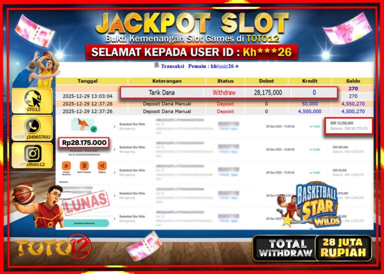 Selamat kepada Member Kami Kh****** Telah Jackpot dan berhasil mendapatkan kemenangan besar pada permainan JACKPOT SLOT GAME (BASKETBALL STAR WILDS) Dengan Kemenangan Sebesar Rp.28.175.000 –. Setelah mengisi Fomulir Withdraw dengan Kurang waktu 1-2 Menit Dana sudah kami Trasnfer kepada Pemilik Userid dan dana sudah dapat di cairkan oleh pemenang. Bukti Pembayaran yang TOTO12 berikan merupakan Bukti…