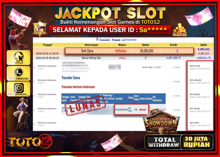 Selamat kepada Member Kami Sa**** Telah Jackpot dan berhasil mendapatkan kemenangan besar pada permainan JACKPOT SLOT GAME (WILD BOUNTY SHOWDOWN) Dengan Kemenangan Sebesar Rp.30.000.000–. Setelah mengisi Fomulir Withdraw dengan Kurang waktu 1-2 Menit Dana sudah kami Trasnfer kepada Pemilik Userid dan dana sudah dapat di cairkan oleh pemenang. Bukti Pembayaran yang TOTO12 berikan merupakan Bukti Pembayaran…