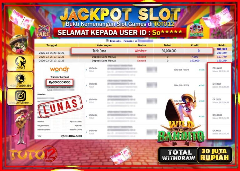Selamat kepada Member Kami So**** Telah Jackpot dan berhasil mendapatkan kemenangan besar pada permainan JACKPOT SLOT GAME (WILD BANDITO) Dengan Kemenangan Sebesar Rp.30.000.000–. Setelah mengisi Fomulir Withdraw dengan Kurang waktu 1-2 Menit Dana sudah kami Trasnfer kepada Pemilik Userid dan dana sudah dapat di cairkan oleh pemenang. Bukti Pembayaran yang TOTO12 berikan merupakan Bukti Pembayaran yang SAH…