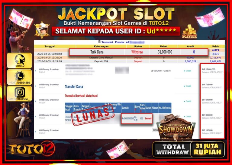 Selamat kepada Member Kami Ud**** Telah Jackpot dan berhasil mendapatkan kemenangan besar pada permainan JACKPOT SLOT GAME (WILD BOUNTY SHOWDOWN) Dengan Kemenangan Sebesar Rp.31.000.000–. Setelah mengisi Fomulir Withdraw dengan Kurang waktu 1-2 Menit Dana sudah kami Trasnfer kepada Pemilik Userid dan dana sudah dapat di cairkan oleh pemenang. Bukti Pembayaran yang TOTO12 berikan merupakan Bukti Pembayaran…