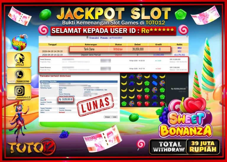 Selamat kepada Member Kami Re***** Telah Jackpot dan berhasil mendapatkan kemenangan besar pada permainan JACKPOT SLOT GAME (SWEET BONANZA) Dengan Kemenangan Sebesar Rp.39.859.000–. Setelah mengisi Fomulir Withdraw dengan Kurang waktu 1-2 Menit Dana sudah kami Trasnfer kepada Pemilik Userid dan dana sudah dapat di cairkan oleh pemenang. Bukti Pembayaran yang TOTO12 berikan merupakan Bukti Pembayaran yang SAH…