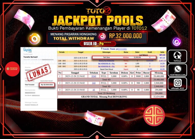 Selamat kepada Member Kami Po****** Telah Jackpot dan berhasil mendapatkan kemenangan besar pada permainan JACKPOT POOLS PASARAN (HONGKONG) Dengan Kemenangan Sebesar Rp.32.000.000 –. Setelah mengisi Fomulir Withdraw dengan Kurang waktu 1-2 Menit Dana sudah kami Trasnfer kepada Pemilik Userid dan dana sudah dapat di cairkan oleh pemenang. Bukti Pembayaran yang TOTO12 berikan merupakan Bukti Pembayaran yang SAH…
