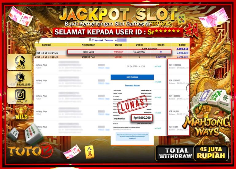Selamat kepada Member Kami Sr****** Telah Jackpot dan berhasil mendapatkan kemenangan besar pada permainan JACKPOT SLOT GAME (MAHJONG WAYS) Dengan Kemenangan Sebesar Rp.45.000.000 –. Setelah mengisi Fomulir Withdraw dengan Kurang waktu 1-2 Menit Dana sudah kami Trasnfer kepada Pemilik Userid dan dana sudah dapat di cairkan oleh pemenang. Bukti Pembayaran yang TOTO12 berikan merupakan Bukti Pembayaran…