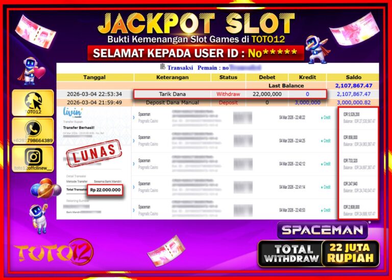 Selamat kepada Member Kami No**** Telah Jackpot dan berhasil mendapatkan kemenangan besar pada permainan JACKPOT SLOT GAME (SPACEMAN Dengan Kemenangan Sebesar Rp.22.000.000–. Setelah mengisi Fomulir Withdraw dengan Kurang waktu 1-2 Menit Dana sudah kami Trasnfer kepada Pemilik Userid dan dana sudah dapat di cairkan oleh pemenang. Bukti Pembayaran yang TOTO12 berikan merupakan Bukti Pembayaran yang SAH /…