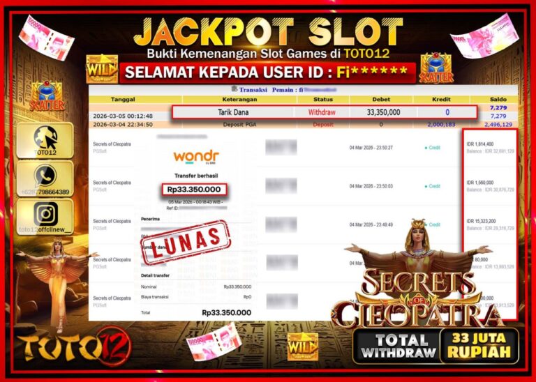 Selamat kepada Member Kami Fi**** Telah Jackpot dan berhasil mendapatkan kemenangan besar pada permainan JACKPOT SLOT GAME (SECRETS OF CLEOPATRA) Dengan Kemenangan Sebesar Rp.33.350.000–. Setelah mengisi Fomulir Withdraw dengan Kurang waktu 1-2 Menit Dana sudah kami Trasnfer kepada Pemilik Userid dan dana sudah dapat di cairkan oleh pemenang. Bukti Pembayaran yang TOTO12 berikan merupakan Bukti Pembayaran…