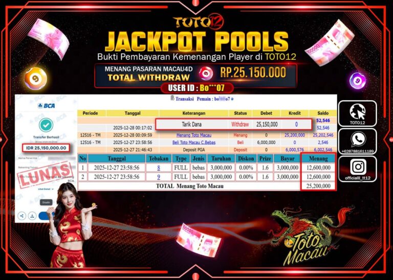 Selamat kepada Member Kami Bo****** Telah Jackpot dan berhasil mendapatkan kemenangan besar pada permainan JACKPOT POOLS PASARAN (MACAU 4D) Dengan Kemenangan Sebesar Rp.25.150.000 –. Setelah mengisi Fomulir Withdraw dengan Kurang waktu 1-2 Menit Dana sudah kami Trasnfer kepada Pemilik Userid dan dana sudah dapat di cairkan oleh pemenang. Bukti Pembayaran yang TOTO12 berikan merupakan Bukti Pembayaran…