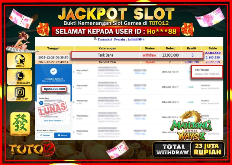 Selamat kepada Member Kami Ho****** Telah Jackpot dan berhasil mendapatkan kemenangan besar pada permainan JACKPOT SLOT GAME (MAHJONG WAYS 2) Dengan Kemenangan Sebesar Rp.23.000.000 –. Setelah mengisi Fomulir Withdraw dengan Kurang waktu 1-2 Menit Dana sudah kami Trasnfer kepada Pemilik Userid dan dana sudah dapat di cairkan oleh pemenang. Bukti Pembayaran yang TOTO12 berikan merupakan Bukti…