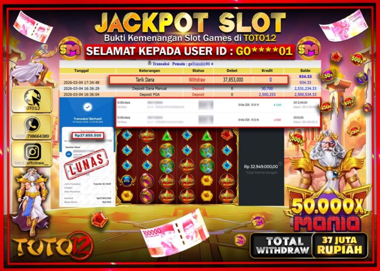 Selamat kepada Member Kami GO****01 Telah Jackpot dan berhasil mendapatkan kemenangan besar pada permainan JACKPOT SLOT GAME (50.000X MANIA) Dengan Kemenangan Sebesar Rp.37.853.000–. Setelah mengisi Fomulir Withdraw dengan Kurang waktu 1-2 Menit Dana sudah kami Trasnfer kepada Pemilik Userid dan dana sudah dapat di cairkan oleh pemenang. Bukti Pembayaran yang TOTO12 berikan merupakan Bukti Pembayaran yang SAH…
