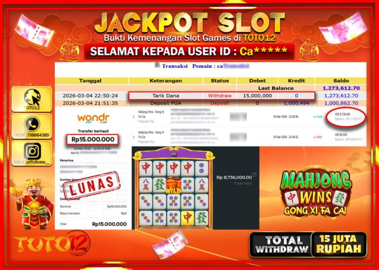 Selamat kepada Member Kami Ca**** Telah Jackpot dan berhasil mendapatkan kemenangan besar pada permainan JACKPOT SLOT GAME (MAHJONG WINS GONG XI FA CAI) Dengan Kemenangan Sebesar Rp.15.000.000–. Setelah mengisi Fomulir Withdraw dengan Kurang waktu 1-2 Menit Dana sudah kami Trasnfer kepada Pemilik Userid dan dana sudah dapat di cairkan oleh pemenang. Bukti Pembayaran yang TOTO12 berikan…
