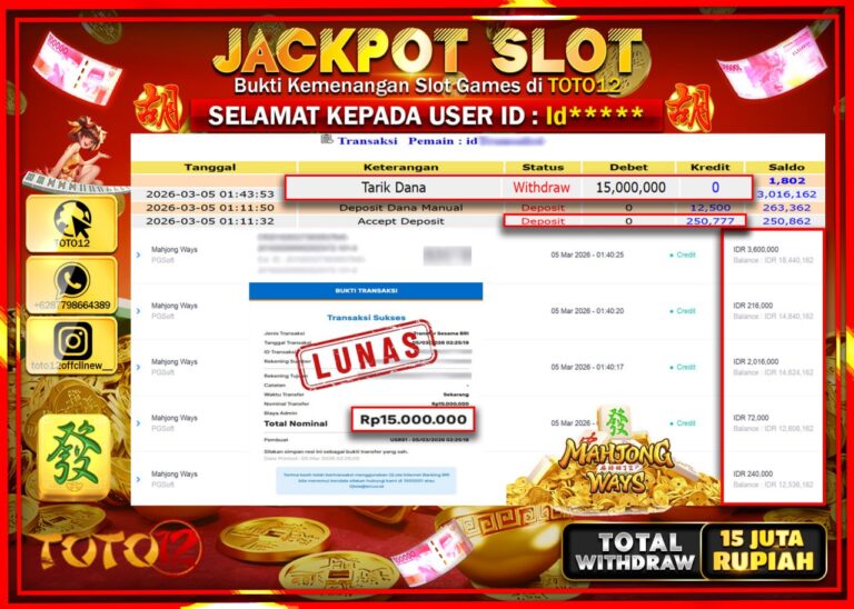 Selamat kepada Member Kami Id**** Telah Jackpot dan berhasil mendapatkan kemenangan besar pada permainan JACKPOT SLOT GAME (MAHJONG WAYS) Dengan Kemenangan Sebesar Rp.15.000.000–. Setelah mengisi Fomulir Withdraw dengan Kurang waktu 1-2 Menit Dana sudah kami Trasnfer kepada Pemilik Userid dan dana sudah dapat di cairkan oleh pemenang. Bukti Pembayaran yang TOTO12 berikan merupakan Bukti Pembayaran yang SAH…