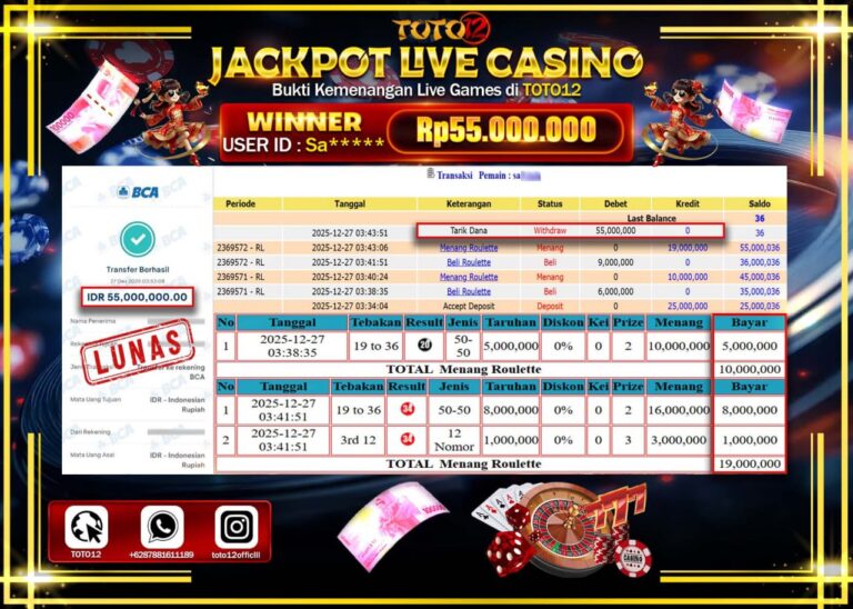 Selamat kepada Member Kami Sa****** Telah Jackpot dan berhasil mendapatkan kemenangan besar pada permainan JACKPOT LIVE CASINO (ROULETTE) Dengan Kemenangan Sebesar Rp.55.000.000 –. Setelah mengisi Fomulir Withdraw dengan Kurang waktu 1-2 Menit Dana sudah kami Trasnfer kepada Pemilik Userid dan dana sudah dapat di cairkan oleh pemenang. Bukti Pembayaran yang TOTO12 berikan merupakan Bukti Pembayaran yang SAH…