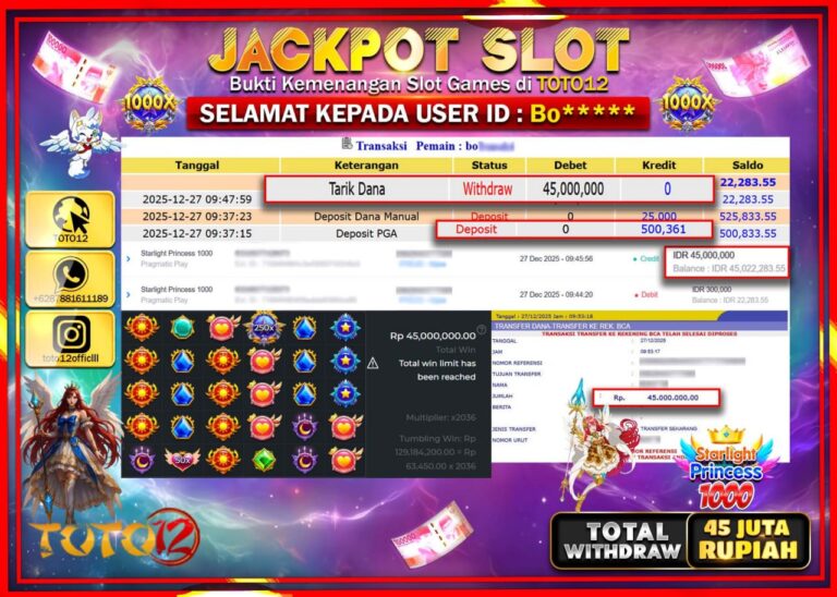 Selamat kepada Member Kami Bo****** Telah Jackpot dan berhasil mendapatkan kemenangan besar pada permainan JACKPOT SLOT GAME (STARLIGHT PRINCESS 1000) Dengan Kemenangan Sebesar Rp.45.000.000 –. Setelah mengisi Fomulir Withdraw dengan Kurang waktu 1-2 Menit Dana sudah kami Trasnfer kepada Pemilik Userid dan dana sudah dapat di cairkan oleh pemenang. Bukti Pembayaran yang TOTO12 berikan merupakan Bukti…