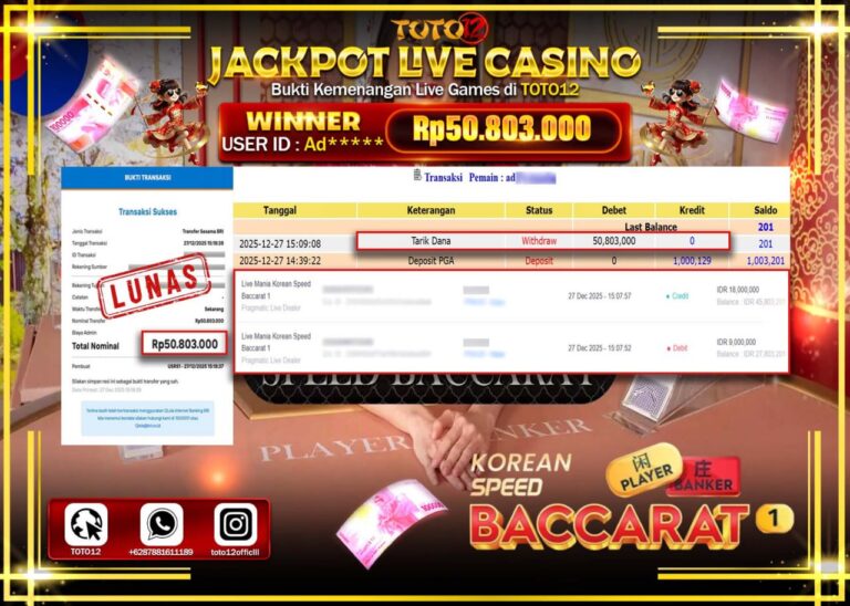 Selamat kepada Member Kami Ad****** Telah Jackpot dan berhasil mendapatkan kemenangan besar pada permainan JACKPOT LIVE CASINO(KOREAN SPEED BACCARAT) Dengan Kemenangan Sebesar Rp.50.803.000 –. Setelah mengisi Fomulir Withdraw dengan Kurang waktu 1-2 Menit Dana sudah kami Trasnfer kepada Pemilik Userid dan dana sudah dapat di cairkan oleh pemenang. Bukti Pembayaran yang TOTO12 berikan merupakan Bukti Pembayaran…