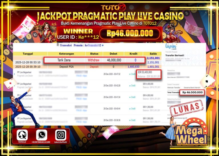 Selamat kepada Member Kami Ke****** Telah Jackpot dan berhasil mendapatkan kemenangan besar pada permainan JACKPOT PRAGMATIC PLAY LIVE CASINO (MEGA WHEEL) Dengan Kemenangan Sebesar Rp.46.000.000 –. Setelah mengisi Fomulir Withdraw dengan Kurang waktu 1-2 Menit Dana sudah kami Trasnfer kepada Pemilik Userid dan dana sudah dapat di cairkan oleh pemenang. Bukti Pembayaran yang TOTO12 berikan merupakan…