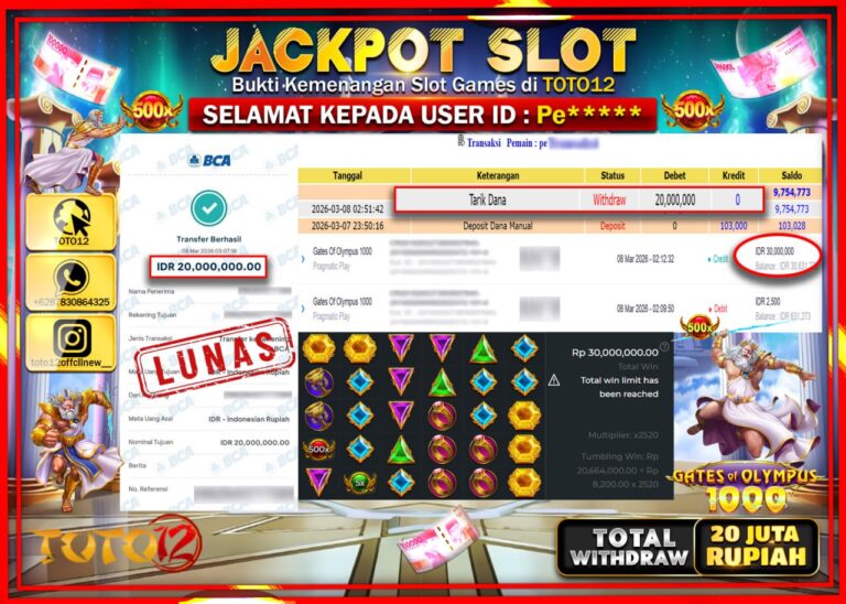 Selamat kepada Member Kami Pe**** Telah Jackpot dan berhasil mendapatkan kemenangan besar pada permainan JACKPOT SLOT GAME (GATES OF OLYMPUS 1000) Dengan Kemenangan Sebesar Rp.20.000.000–. Setelah mengisi Fomulir Withdraw dengan Kurang waktu 1-2 Menit Dana sudah kami Trasnfer kepada Pemilik Userid dan dana sudah dapat di cairkan oleh pemenang. Bukti Pembayaran yang TOTO12 berikan merupakan Bukti…