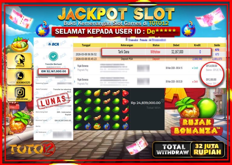 Selamat kepada Member Kami De**** Telah Jackpot dan berhasil mendapatkan kemenangan besar pada permainan JACKPOT SLOT GAME (RUJAK BONANZA) Dengan Kemenangan Sebesar Rp.32.167.000–. Setelah mengisi Fomulir Withdraw dengan Kurang waktu 1-2 Menit Dana sudah kami Trasnfer kepada Pemilik Userid dan dana sudah dapat di cairkan oleh pemenang. Bukti Pembayaran yang TOTO12 berikan merupakan Bukti Pembayaran yang SAH…
