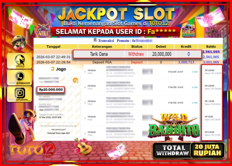 Selamat kepada Member Kami Fa**** Telah Jackpot dan berhasil mendapatkan kemenangan besar pada permainan JACKPOT SLOT GAME (WILD BANDITO) Dengan Kemenangan Sebesar Rp.20.000.000–. Setelah mengisi Fomulir Withdraw dengan Kurang waktu 1-2 Menit Dana sudah kami Trasnfer kepada Pemilik Userid dan dana sudah dapat di cairkan oleh pemenang. Bukti Pembayaran yang TOTO12 berikan merupakan Bukti Pembayaran yang SAH…