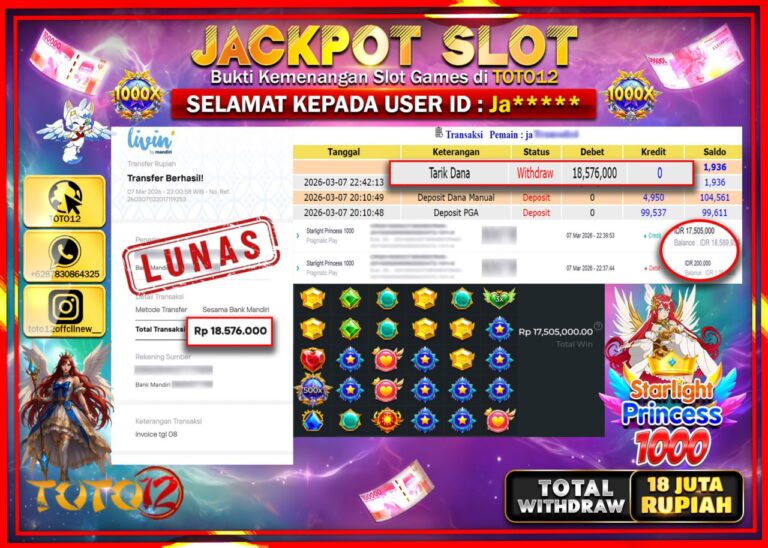 Selamat kepada Member Kami Ja**** Telah Jackpot dan berhasil mendapatkan kemenangan besar pada permainan JACKPOT SLOT GAME (STARLIGHT PRINCESS 1000) Dengan Kemenangan Sebesar Rp.18.576.000–. Setelah mengisi Fomulir Withdraw dengan Kurang waktu 1-2 Menit Dana sudah kami Trasnfer kepada Pemilik Userid dan dana sudah dapat di cairkan oleh pemenang. Bukti Pembayaran yang TOTO12 berikan merupakan Bukti Pembayaran…