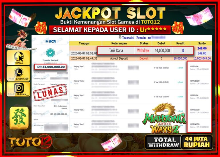 Selamat kepada Member Kami Ur**** Telah Jackpot dan berhasil mendapatkan kemenangan besar pada permainan JACKPOT SLOT GAME (MAHJONG WAYS 2) Dengan Kemenangan Sebesar Rp.44.000.000–. Setelah mengisi Fomulir Withdraw dengan Kurang waktu 1-2 Menit Dana sudah kami Trasnfer kepada Pemilik Userid dan dana sudah dapat di cairkan oleh pemenang. Bukti Pembayaran yang TOTO12 berikan merupakan Bukti Pembayaran…