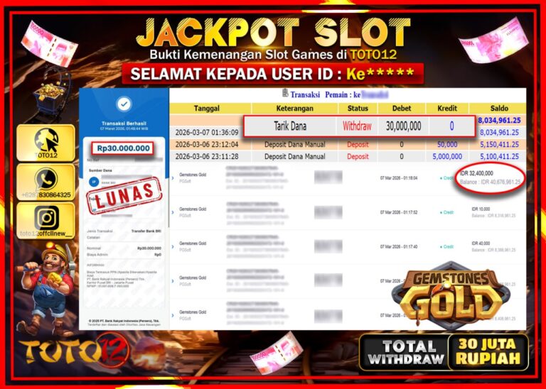 Selamat kepada Member Kami Ke**** Telah Jackpot dan berhasil mendapatkan kemenangan besar pada permainan JACKPOT SLOT GAME (GEMSTONES GOLD) Dengan Kemenangan Sebesar Rp.30.000.000–. Setelah mengisi Fomulir Withdraw dengan Kurang waktu 1-2 Menit Dana sudah kami Trasnfer kepada Pemilik Userid dan dana sudah dapat di cairkan oleh pemenang. Bukti Pembayaran yang TOTO12 berikan merupakan Bukti Pembayaran yang SAH…