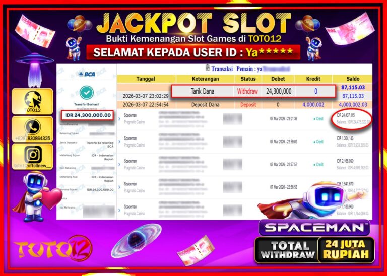 Selamat kepada Member Kami Ya**** Telah Jackpot dan berhasil mendapatkan kemenangan besar pada permainan JACKPOT SLOT GAME (SPACEMAN) Dengan Kemenangan Sebesar Rp.24.300.000–. Setelah mengisi Fomulir Withdraw dengan Kurang waktu 1-2 Menit Dana sudah kami Trasnfer kepada Pemilik Userid dan dana sudah dapat di cairkan oleh pemenang. Bukti Pembayaran yang TOTO12 berikan merupakan Bukti Pembayaran yang SAH /…