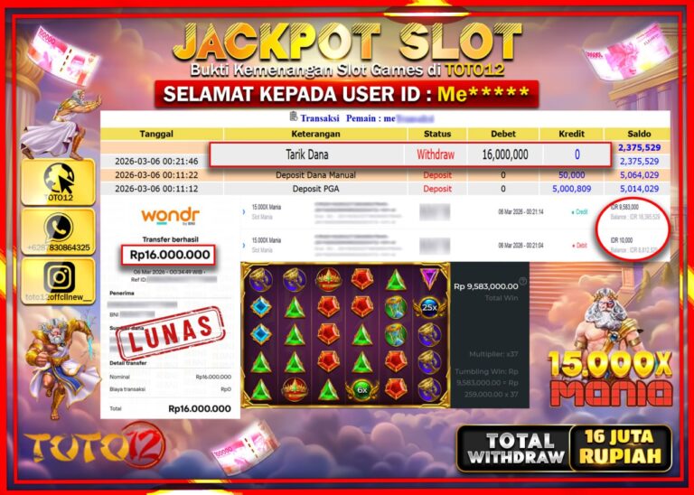 Selamat kepada Member Kami Me**** Telah Jackpot dan berhasil mendapatkan kemenangan besar pada permainan JACKPOT SLOT GAME (15.000X MANIA) Dengan Kemenangan Sebesar Rp.16.000.000–. Setelah mengisi Fomulir Withdraw dengan Kurang waktu 1-2 Menit Dana sudah kami Trasnfer kepada Pemilik Userid dan dana sudah dapat di cairkan oleh pemenang. Bukti Pembayaran yang TOTO12 berikan merupakan Bukti Pembayaran yang SAH…