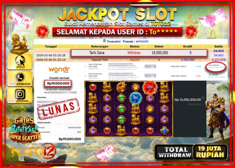 Selamat kepada Member Kami To**** Telah Jackpot dan berhasil mendapatkan kemenangan besar pada permainan JACKPOT SLOT GAME (GATES OF GATOTKACA SUPER SCATTER) Dengan Kemenangan Sebesar Rp.19.000.000–. Setelah mengisi Fomulir Withdraw dengan Kurang waktu 1-2 Menit Dana sudah kami Trasnfer kepada Pemilik Userid dan dana sudah dapat di cairkan oleh pemenang. Bukti Pembayaran yang TOTO12 berikan merupakan…