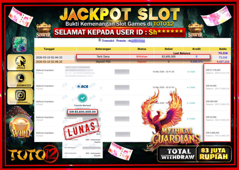 Selamat kepada Member Kami Sh**** Telah Jackpot dan berhasil mendapatkan kemenangan besar pada permainan JACKPOT SLOT GAME (MYTHICAL GUARDIANS) Dengan Kemenangan Sebesar Rp.83.600.000–. Setelah mengisi Fomulir Withdraw dengan Kurang waktu 1-2 Menit Dana sudah kami Trasnfer kepada Pemilik Userid dan dana sudah dapat di cairkan oleh pemenang. Bukti Pembayaran yang TOTO12 berikan merupakan Bukti Pembayaran yang SAH…