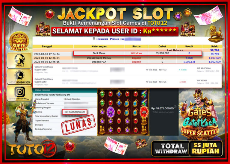 Selamat kepada Member Kami Ka**** Telah Jackpot dan berhasil mendapatkan kemenangan besar pada permainan JACKPOT SLOT GAME (GATES OF GATOT KACA SUPER SCATTER) Dengan Kemenangan Sebesar Rp.55.000.000–. Setelah mengisi Fomulir Withdraw dengan Kurang waktu 1-2 Menit Dana sudah kami Trasnfer kepada Pemilik Userid dan dana sudah dapat di cairkan oleh pemenang. Bukti Pembayaran yang TOTO12 berikan…