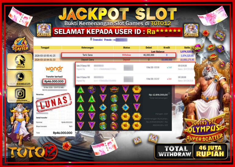 Selamat kepada Member Kami Ma**** Telah Jackpot dan berhasil mendapatkan kemenangan besar pada permainan JACKPOT SLOT GAME (SWEET BONANZA 1000) Dengan Kemenangan Sebesar Rp.42.200.000–. Setelah mengisi Fomulir Withdraw dengan Kurang waktu 1-2 Menit Dana sudah kami Trasnfer kepada Pemilik Userid dan dana sudah dapat di cairkan oleh pemenang. Bukti Pembayaran yang TOTO12 berikan merupakan Bukti Pembayaran…
