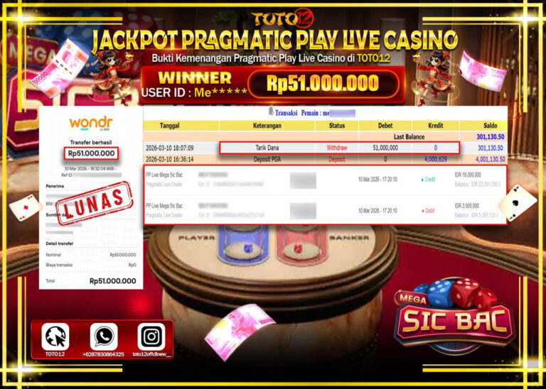 Selamat kepada Member Kami Me**** Telah Jackpot dan berhasil mendapatkan kemenangan besar pada permainan JACKPOT PRAGMATIC PLAY LIVE CASINO (MEGA SIC BAC) Dengan Kemenangan Sebesar Rp.51.000.000–. Setelah mengisi Fomulir Withdraw dengan Kurang waktu 1-2 Menit Dana sudah kami Trasnfer kepada Pemilik Userid dan dana sudah dapat di cairkan oleh pemenang. Bukti Pembayaran yang TOTO12 berikan merupakan…