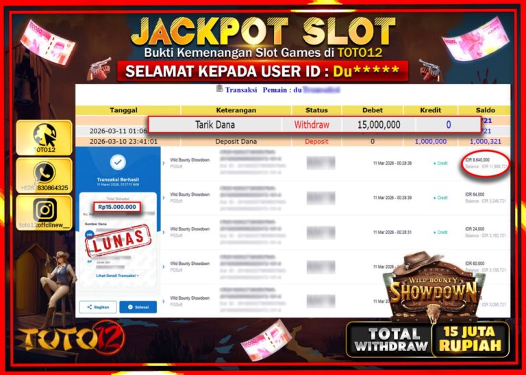 Selamat kepada Member Kami Du**** Telah Jackpot dan berhasil mendapatkan kemenangan besar pada permainan JACKPOT SLOT GAME (WILD BOUNTY SHOWDOWN) Dengan Kemenangan Sebesar Rp.15.000.000–. Setelah mengisi Fomulir Withdraw dengan Kurang waktu 1-2 Menit Dana sudah kami Trasnfer kepada Pemilik Userid dan dana sudah dapat di cairkan oleh pemenang. Bukti Pembayaran yang TOTO12 berikan merupakan Bukti Pembayaran…