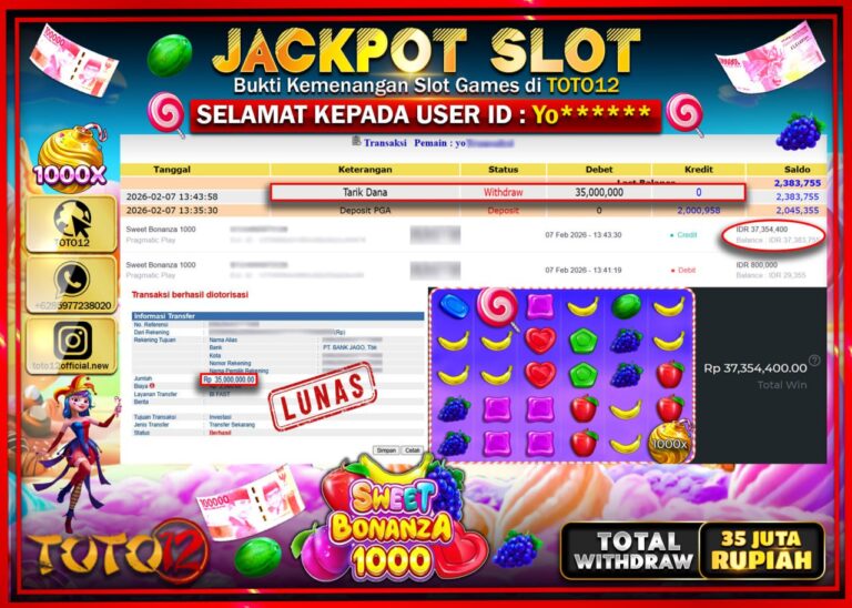 Selamat kepada Member Kami Yo***** Telah Jackpot dan berhasil mendapatkan kemenangan besar pada permainan JACKPOT SLOT GAME (SWEET BONANZA 1000 ) Dengan Kemenangan Sebesar Rp.35.000.000–. Setelah mengisi Fomulir Withdraw dengan Kurang waktu 1-2 Menit Dana sudah kami Trasnfer kepada Pemilik Userid dan dana sudah dapat di cairkan oleh pemenang. Bukti Pembayaran yang TOTO12 berikan merupakan Bukti…