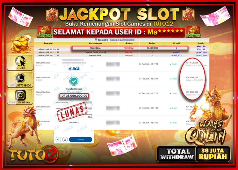Selamat kepada Member Kami Ma***** Telah Jackpot dan berhasil mendapatkan kemenangan besar pada permainan JACKPOT SLOT GAME (WAYS OF THE QILIN) Dengan Kemenangan Sebesar Rp.38.000.000–. Setelah mengisi Fomulir Withdraw dengan Kurang waktu 1-2 Menit Dana sudah kami Trasnfer kepada Pemilik Userid dan dana sudah dapat di cairkan oleh pemenang. Bukti Pembayaran yang TOTO12 berikan merupakan Bukti…