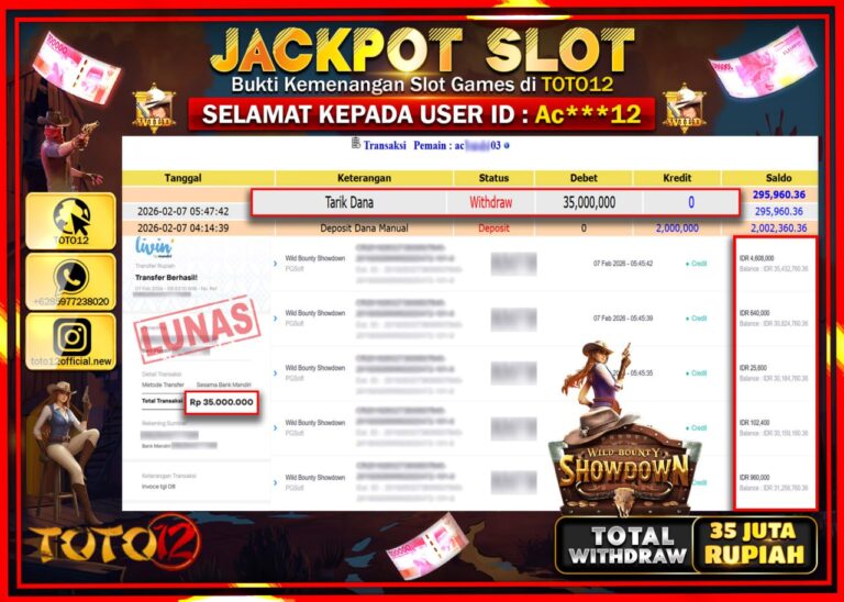 Selamat kepada Member Kami Ac*****12 Telah Jackpot dan berhasil mendapatkan kemenangan besar pada permainan JACKPOT SLOT GAME (WILD BOUNTY SHOWDOWN ) Dengan Kemenangan Sebesar Rp.35.000.000–. Setelah mengisi Fomulir Withdraw dengan Kurang waktu 1-2 Menit Dana sudah kami Trasnfer kepada Pemilik Userid dan dana sudah dapat di cairkan oleh pemenang. Bukti Pembayaran yang TOTO12 berikan merupakan Bukti…
