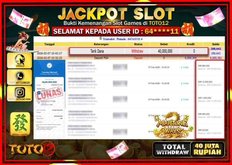 Selamat kepada Member Kami 64*****11 Telah Jackpot dan berhasil mendapatkan kemenangan besar pada permainan JACKPOT SLOT GAME (MAHJONG WAYS ) Dengan Kemenangan Sebesar Rp.40.000.000–. Setelah mengisi Fomulir Withdraw dengan Kurang waktu 1-2 Menit Dana sudah kami Trasnfer kepada Pemilik Userid dan dana sudah dapat di cairkan oleh pemenang. Bukti Pembayaran yang TOTO12 berikan merupakan Bukti Pembayaran…