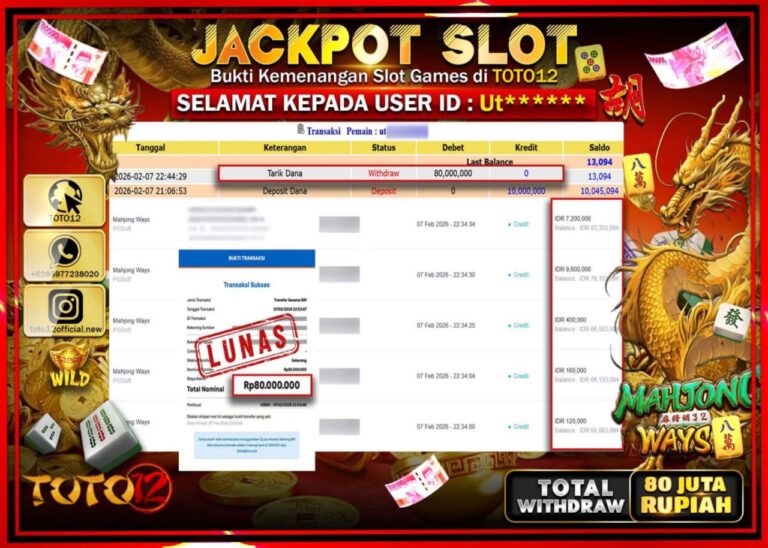 Selamat kepada Member Kami Ut***** Telah Jackpot dan berhasil mendapatkan kemenangan besar pada permainan JACKPOT SLOT GAME (MAHJONG WAYS ) Dengan Kemenangan Sebesar Rp.80.000.000–. Setelah mengisi Fomulir Withdraw dengan Kurang waktu 1-2 Menit Dana sudah kami Trasnfer kepada Pemilik Userid dan dana sudah dapat di cairkan oleh pemenang. Bukti Pembayaran yang TOTO12 berikan merupakan Bukti Pembayaran…