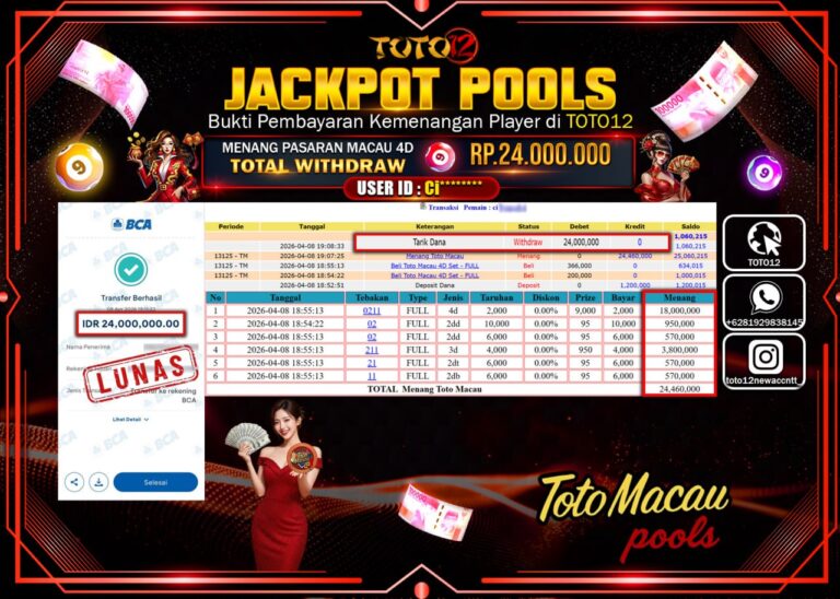 Selamat kepada Member Kami Ci****** Telah Jackpot dan berhasil mendapatkan kemenangan besar pada permainan JACKPOT POOLS PASARAN (MACAU 4D) Dengan Kemenangan Sebesar Rp.24.000.000–. Setelah mengisi Fomulir Withdraw dengan Kurang waktu 1-2 Menit Dana sudah kami Trasnfer kepada Pemilik Userid dan dana sudah dapat di cairkan oleh pemenang. Bukti Pembayaran yang TOTO12 berikan merupakan Bukti Pembayaran yang SAH…
